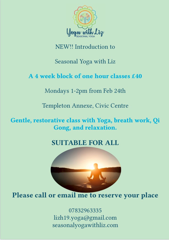 If you live locally please Join me on Monday the 24th of February, in the lovely hall of the Templeton Annexe (next to the Civic Centre) for a 4 week introduction to the unique and uplifting seasonal yoga experience that aligns your body and mind with the natural rhythms of the seasons. In each class, you’ll learn how to work with your energy, moving in harmony with the time of year to feel more balanced, vibrant, and at ease.